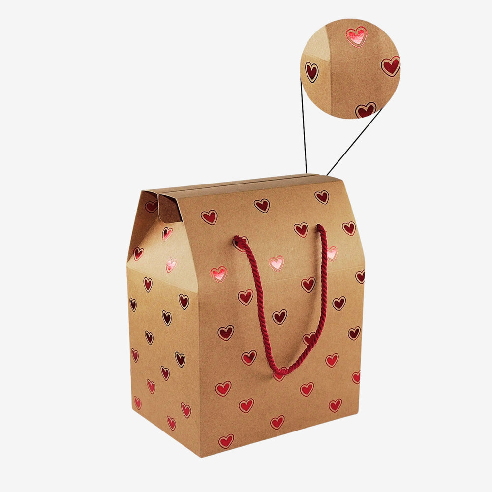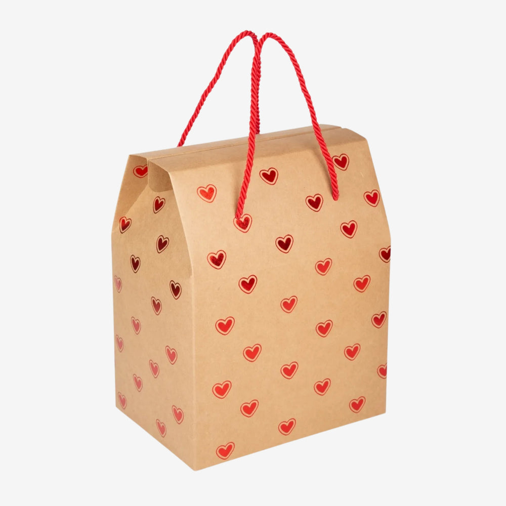 xDoğallığın sıcaklığı ile aşkın simgesi kırmızı kalpleri bir araya getiren Red Craft Bag hediye kutusu, kraft zemin üzerine serpiştirilmiş parlak kalp detaylarıyla sade ama duygusal bir sunum sunar. Romantik bir atmosfer yaratmak isteyenler için ideal olan bu kutu, özellikle Sevgililer Günü, yıldönümü, özel tebrikler ve butik hediye sunumları için tercih edilir. Hem çevre dostu duruşu hem de zarif tasarımıyla fark yaratır.