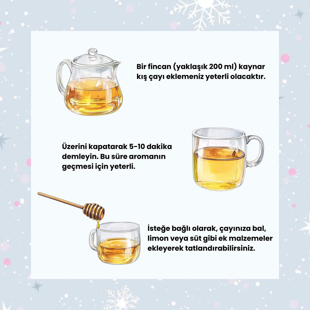Bir fincan için 1 tatlı kaşığı Kış Çayı’nı sıcak suya ekleyin, 7–10 dakika demlenmeye bırakın. Bal veya limon ekleyerek lezzetini zenginleştirebilirsiniz.